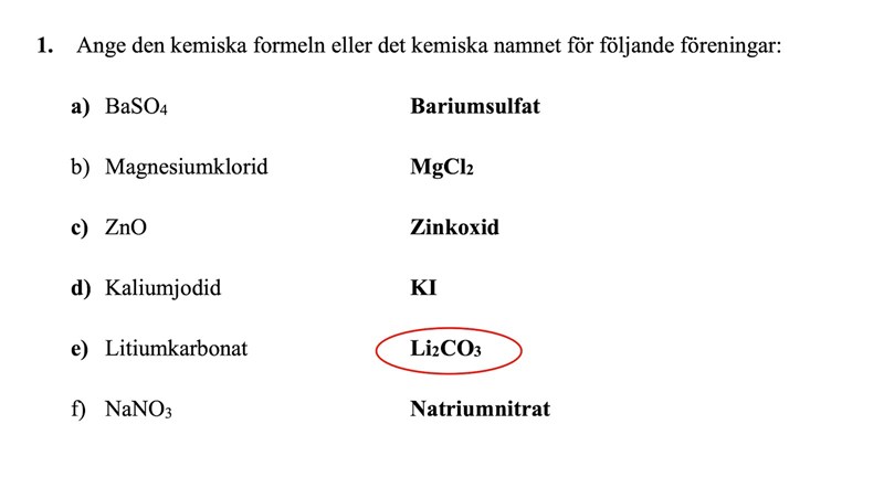 Ange den kemiska formeln eller det kemiska namnet för följande föreningar