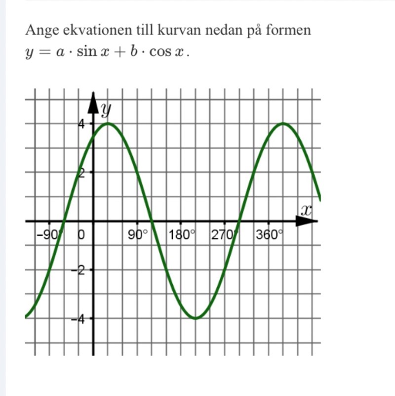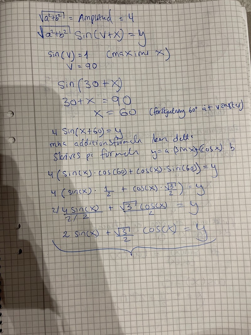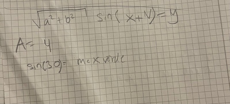 Så här har jag börjat. Men jag fastnar nu på hur jag ska göra för att hitta förskjutningen i grafen. Jag ser att du vinkeln är 30, dvs då x=30 får vi ett maxvärde. Jag vet också att sin(90)=1 dvs det ger oss ett maxvärdet. Hur kan jag använda den informationen för att hitta förskjutningen som jag i min uträkning har kallat för v