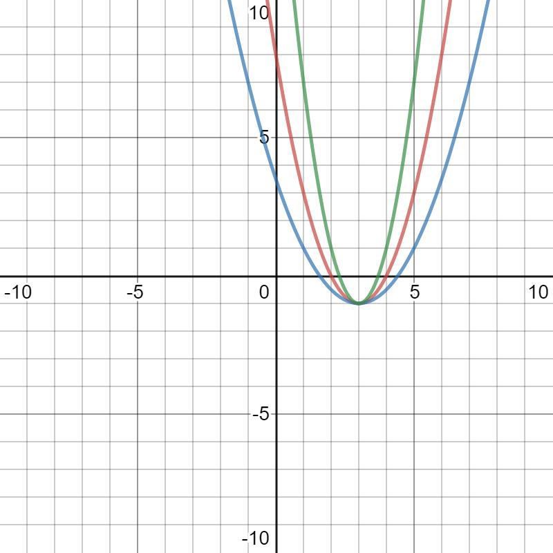 Hjälper de här bilden dig? Kurvorna är y = 2(x-3)2-1, y = (x-3)2-1 respektive y = ½(x-3)2-1.