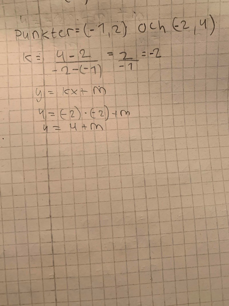 Hej! Har fastnat på uppgift 1253. Jag har bifogat min lösning. Det är fråga a) och linje a som jag har räknat ut. Får svaret till y = -2x men enligt facit är svaret y = -2x -2.
