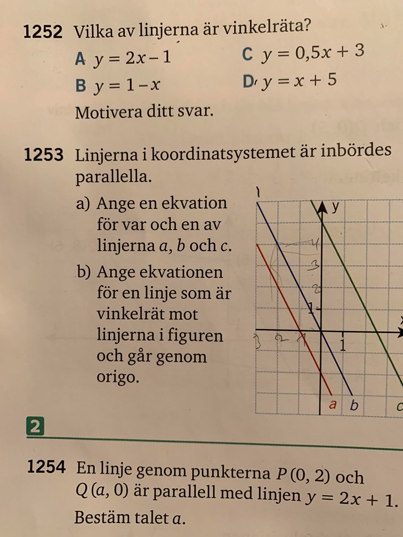 Student02 skrev:Hej! Har fastnat på uppgift 1253. Jag har bifogat min lösning. Det är fråga a) och linje a som jag har räknat ut. Får svaret till y = -2x men enligt facit är svaret y = -2x -2.