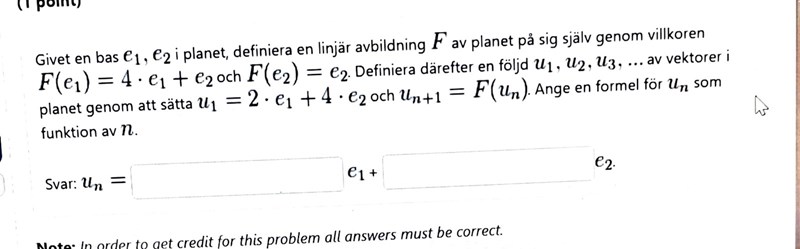 Nu kanske jag är ute och cyklar ,men e2 kan skrivas som F(e1)-4e1. Så F(e2)=F(e1)-4e1. Om det ej är hjälpsamt vet jag tyvärr ej. Men F(e2)=e2 är ju då ( 0, 1) eller vad är den annars??