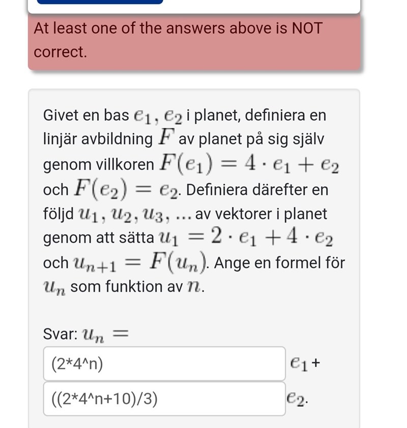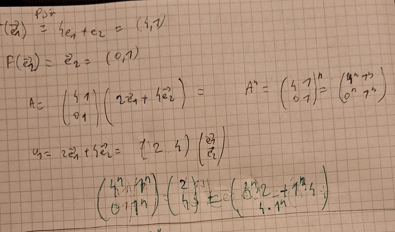 Ingen fara. Men varför un-1? Det är just det jag ej förstår. Det var väldigt tydligt när du skrev un+1=F(un). Jag antar att vi ska multiplicera An-1 med u1= (2,4) för att få svaret?