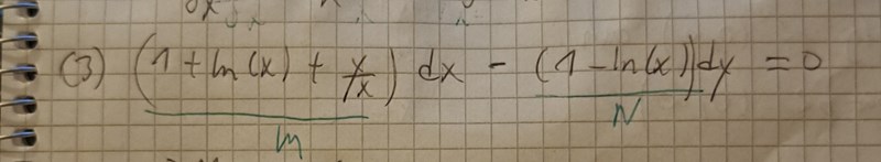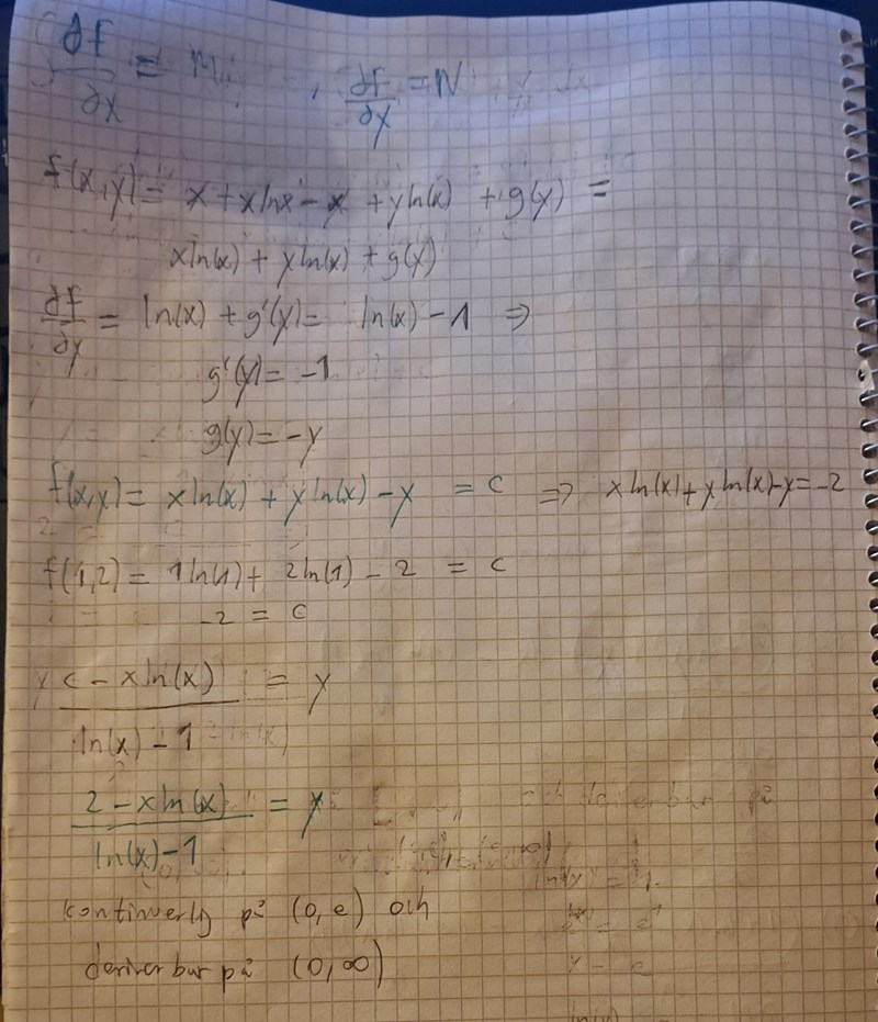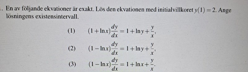 Jag kollade om alla 3 diffekvationer är exakt och bara den sista är det. Det är så att facit fick samma uttryck som mig när det gäller att skriva på explicit form men de har istället 1-ln(x). Hur rättar jag till för att få samma uttryck som dem? Annars blir punkten (1,-2) istället för (1,2). En annan sak som jag undrar gällande existensintervall är om man ska titta på differentialekvationen som är olöst i början för att bestämma existensintervall eller bara den lösta differentialekvationen ? Funktionen är kontinuerlig på (0,e) och deriverbar på (0,inf) där vår initial value finns i både intervall. Jag antar att man hellre väljer (0,e) pga nämnaren inte är definierad för e som finns i andra intervallet.