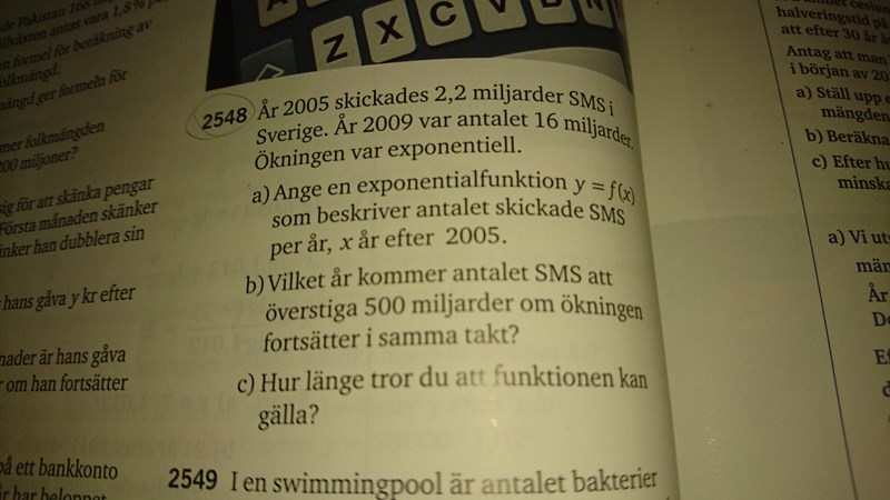 Du vet hur många SMS som skickades år 2009, så du vet f(4). Använd detta för att beräkna värdet på konstanten a.