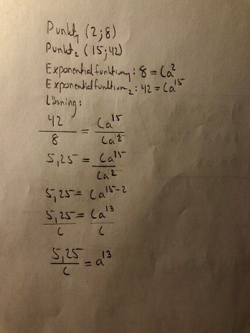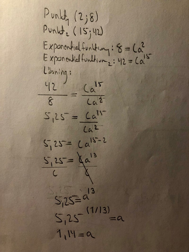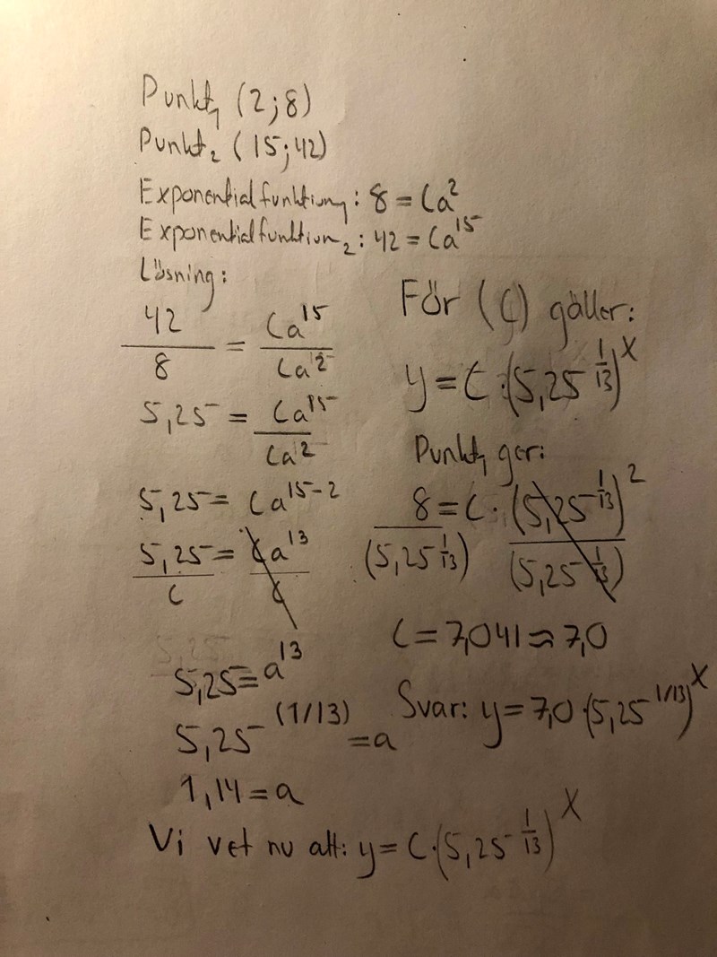 Men ifall denna fråga hade kommit på ett prov Yngve, hade jag fått rätt med den uträkningen som står på mitt papper och min slutgiltiga exponentialfunktion?