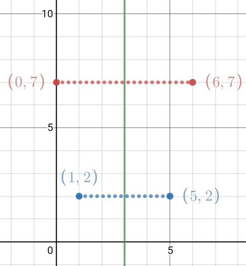 Se bild, där jag har markerat symmetrilinjen x = 3 med grönt och placerat ut de fyra punkterna.