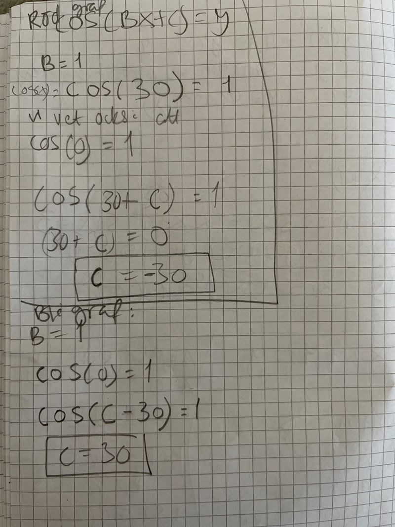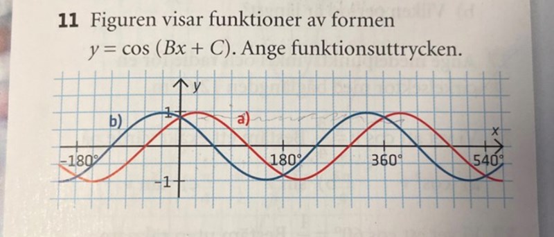 Ja men när jag försöker lösa uppgiften så förstår jag inte varför det är fel att i a , anta att grafen behöver förskjutas 30 grader åt vänster för att kunna se ut som en vanlig cosinus kurva alltså måste C= +30 men det är fel enligt facit