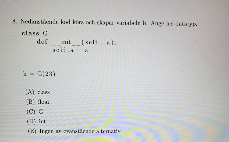 Jag valde D) men rätt svar är C) , är det för att G är ett namn på klassen och när vi tilldelar G(23) så får h datatypen klass?