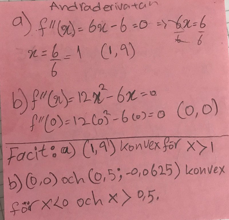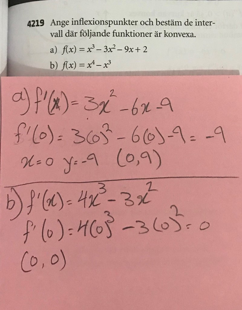 Deriveringarna är rätt, men inflexionspunkt har du där andraderivatan är noll.