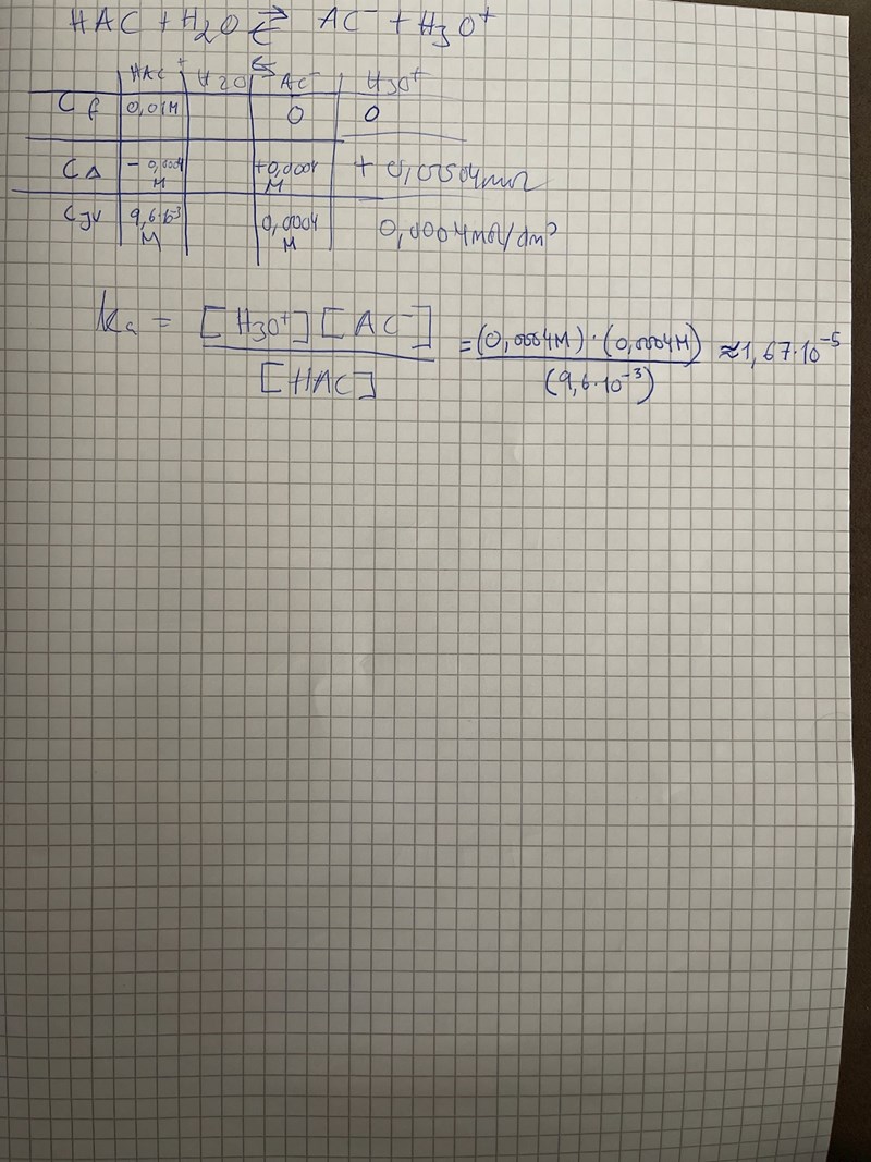 För att lösa frågan så antar jag att det är HAc som reagerar med vatten. Att 4% av molekylerna protolyseras betyder att 4% av 0.01M kommer ”försvinna”. Har jag räknat rätt (se lösning ovan) :)
