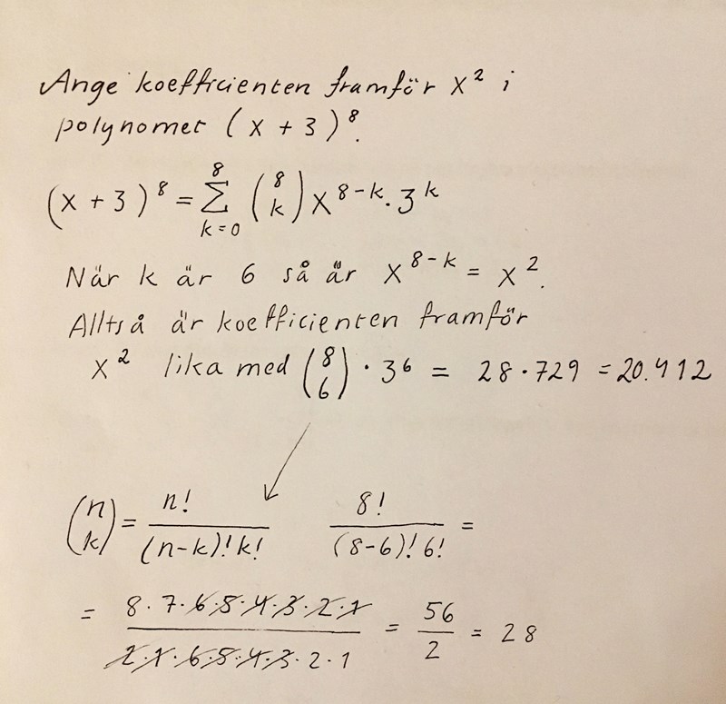Jag ska ange koefficienten framför x^2 i polynomet (x+3)^8.