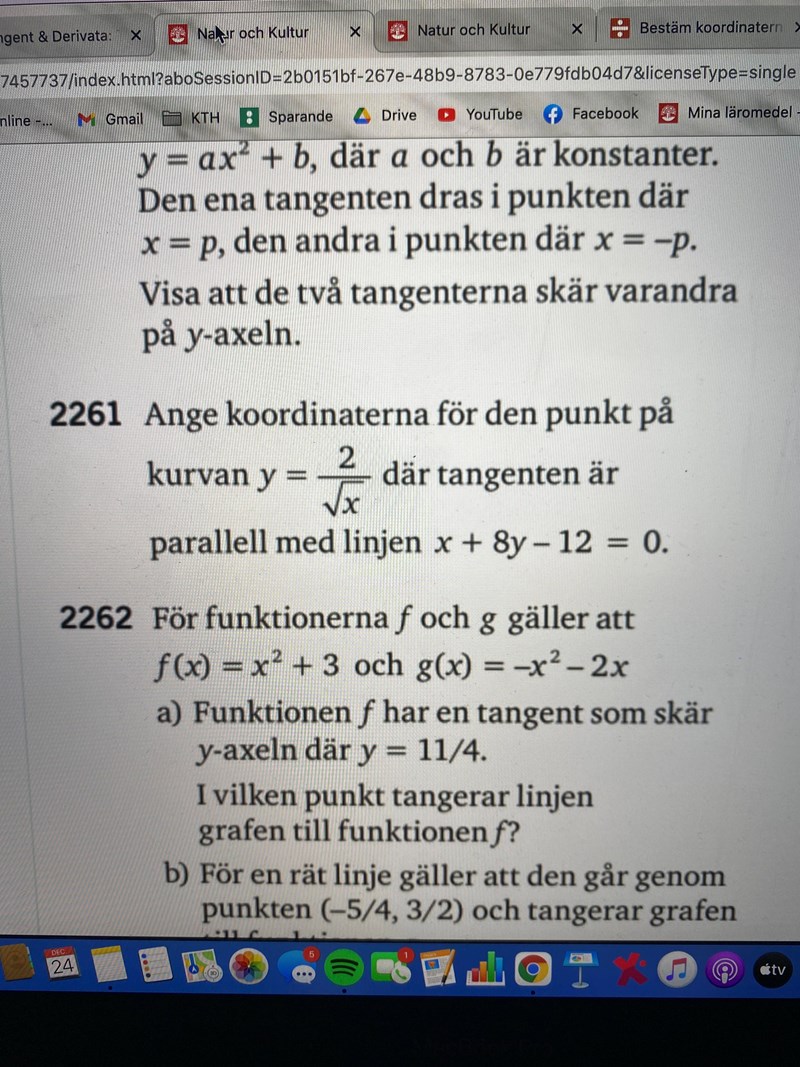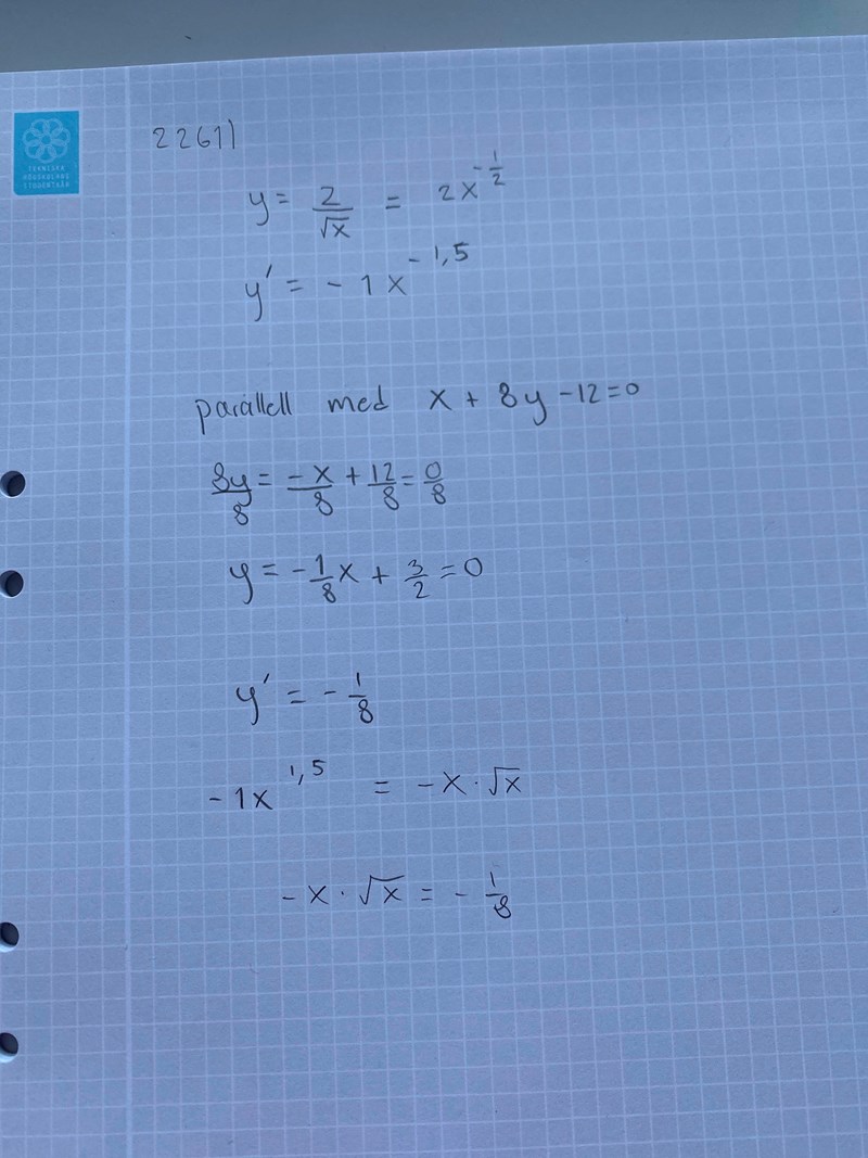 Nästan rätt, men derivatan av kurvan blir Yl = -2/(2X3/2) = -1/8. Detta leder till -X=8, dvs X=4.