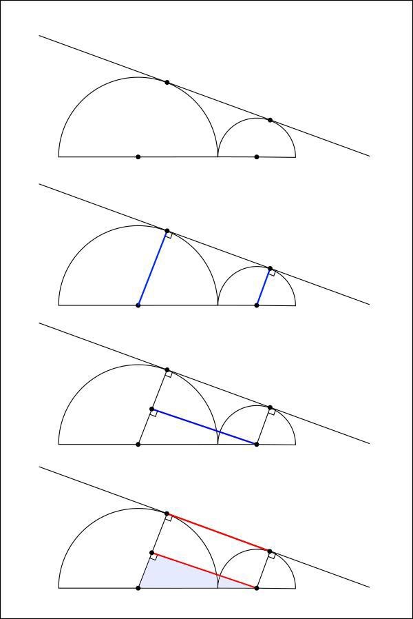 Detta är nog enklast att lösa med likformighet. Eftersom linjen mellan T1 och T2 tangerar cirklarna vet vi att linjen är vinkelrät mot radier i cirklarna.