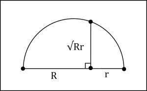 så kan man uppmärksamma att inte bara är "kvadratroten av produkten" utan har en geometrisk tolkning som det så kallade geometriska medelvärdet av R och r vilket kan konstrueras på flera sätt men där den kändaste sätten, förekommande exempelvis i Descartes magnus opus, är via en cirkel diameter med R + r och en vinkelrät linje till denna diameter.