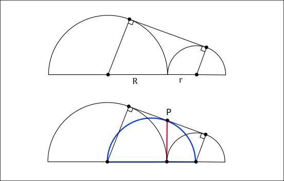 Då vårt problem har de två sträckorna R och r liggandes angränsandes i figuren blir det lovande att man i alla fall kan testa att skriva in denna konstruktion i figuren och se om det ger några idéer