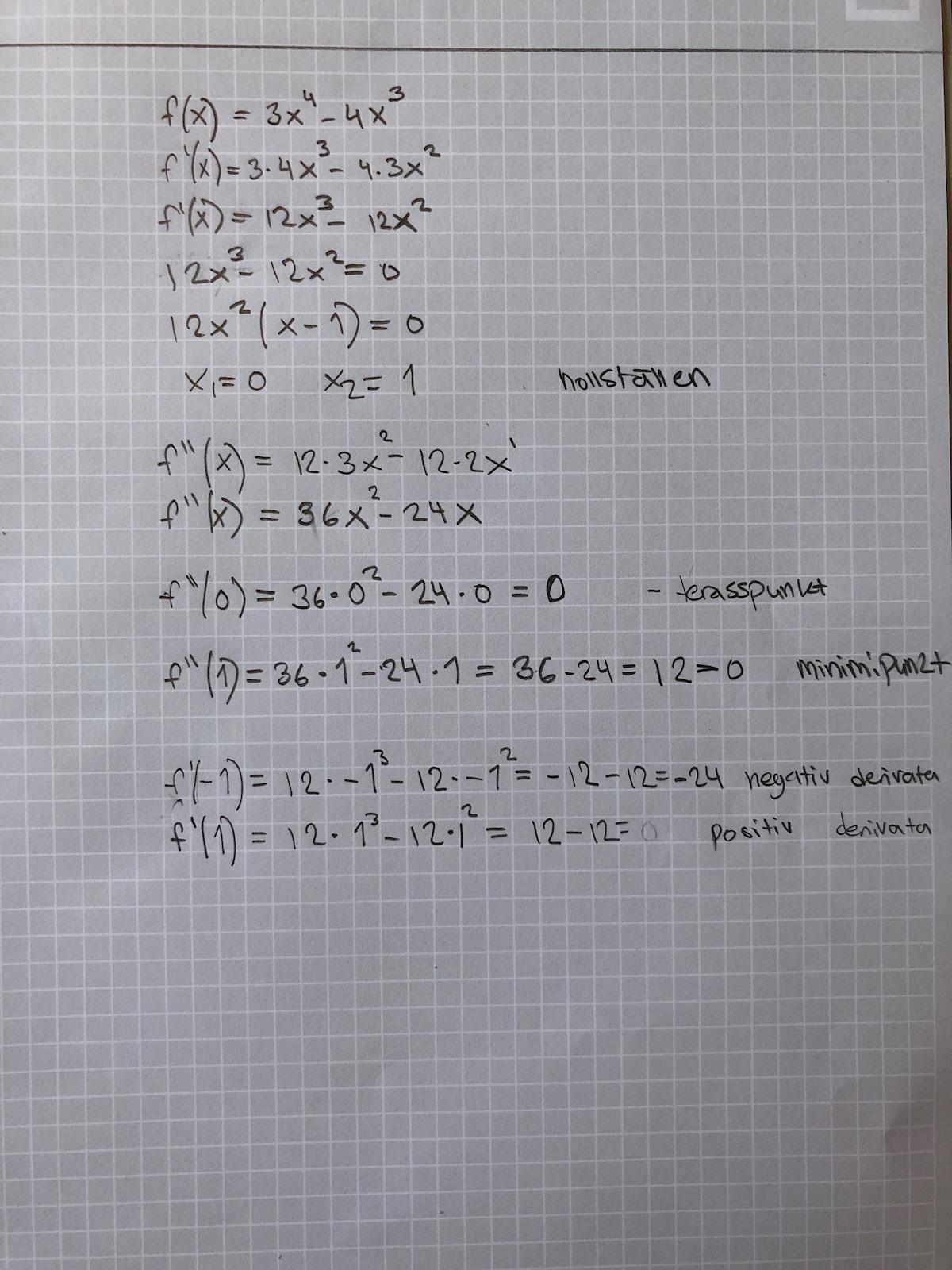 Ange med hjälp av derivatan eventuella maximi-, minimi- och terrasspunkter till funktionen f(x)=3x^4-4x^3