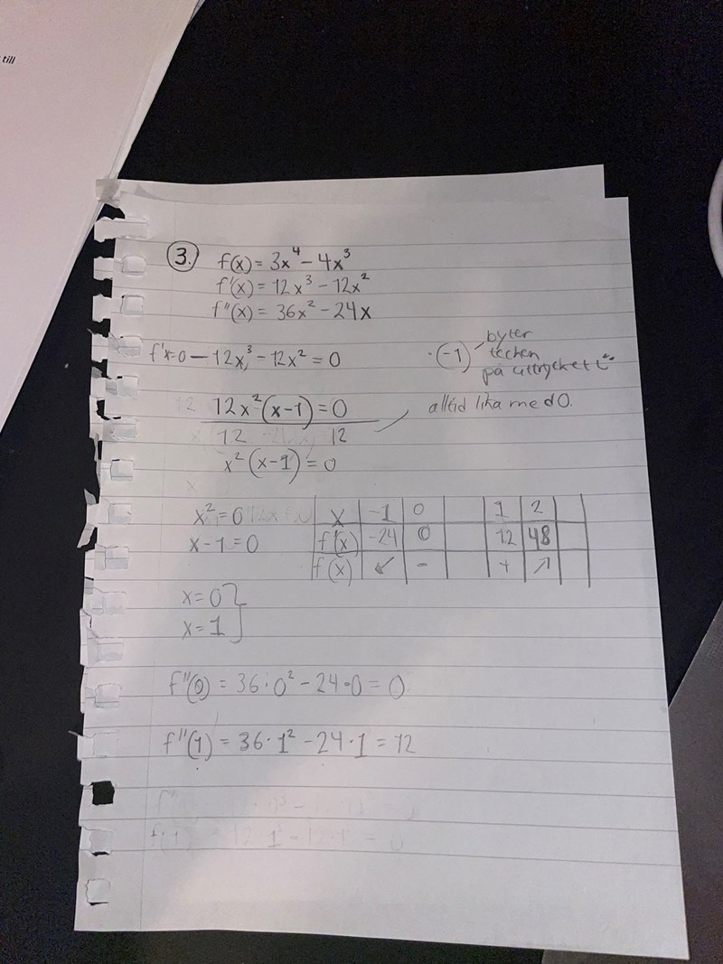 ange med derivatan eventuella maximi- , minimi- och terasspunkter till funktionen f(x)= 3x^4-4x^3