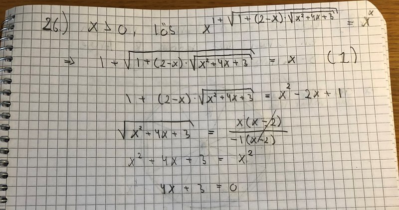 Skaft skrev:Håll utkik efter "känsliga" steg i beräkningen. Division med noll, t.ex: du dividerar båda led med x-2, vilket innebär att resten av beräkningen förutsätter att . Så vad händer istället om x=2? Det fallet måste undersökas separat.