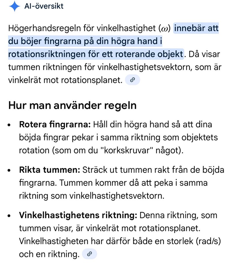 När jag använder högerhandsregeln med tummen riktad åt den riktning x-axeln är i din figur från #17 så visar mina fingrar att skivan roterar medurs och då är det positivt x-axeln men om jag hade riktat min tumme åt vänster dvs negativ x-axeln så hade w roterat i moturs riktning. Antar att man ska tänka så?