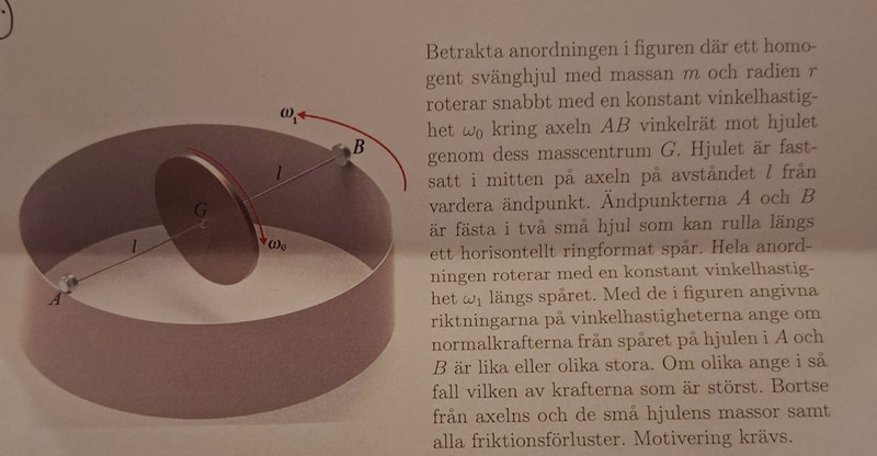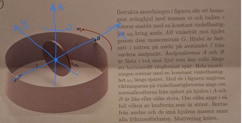 PATENTERAMERA skrev:Ja. Enklast är nog att införa ett roterande koordinatsystem där x-axeln ligger längs axeln AB och z-axeln är riktad uppåt. Origo i G.