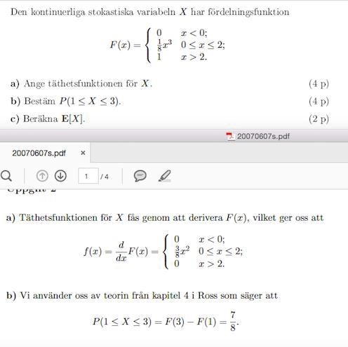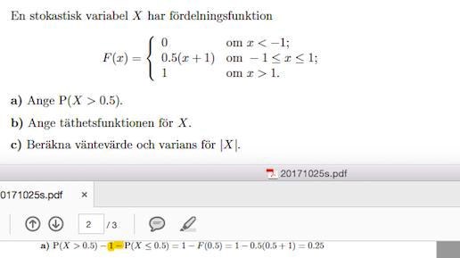 Så tex i uppgift 2, så deriverar man, tar den derivatan, och substituerar in 3an, minus 1. Men varför inte göra det i stora F?Nej dom "substituerar inte in lilla f". Dom använder fördelningsfunktionen och dess egenskaper. De tar fram täthetsfunktionen, alltså derivatan av fördelningsfunktionen i a), det är korrekt, men det är för att det är det uppgiften handlar om, inte att hitta någon sannolikhet. Fördelningsfunktionen definieras ju som: , och alltså är det just det som dom använder i uppgifterna för att få fram sannolikheten för och .