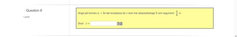 Ange på formen a+bi det komplexa tal z som har absolutbelopp 5 och argument 5/6 π .