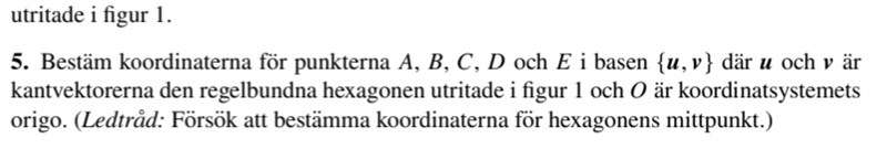 Hej, har försökt löst ut att A är (1,0), E är (0,1). Avstånd från O till mittpunkt av figuren är samma som |u|. Sen försökte jag använda rotationsmatris där jag rotera u 60 grader moturs, men det verkar som onödigt i denna frågan. Hur ska man tänka här?