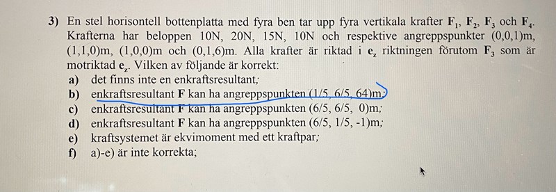 oj aa det råkade jag nog göra. Men när man får (30, -5, 0) blir ju angreppspunkten (1/5, 6/5, 0). Vilket forfarande inte är rätt. Hur får man rätt z-komponent? Eller kan man flytta en enkraftssresultant i z-led?