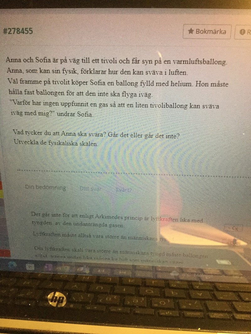 jag förstår frågan och svaret. Min fråga är egentligen, om ballongen ska kunna lyfta en människa så måste lyftkraften på den vara större än tyngden på människan plus ballongen. När jag förstod det började jag tänka för mycket, genom att tänka att en människa påverkas ju även av en normalkraft så nettokraften för människan är noll. Kan någon förklara snälla varför det är tyngden man måste övervinna trots att människan påverkas av en normalkraft somnar ut tyngdkraften.