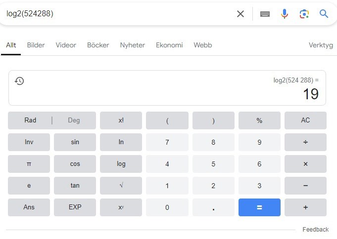 Men om du skulle få uppgiften ". Vilket tal ska du upphöja 2 med för att få 524 288?" alltså så skulle nog varken jag eller så många andra kunna komma på det på 10 sekunder.