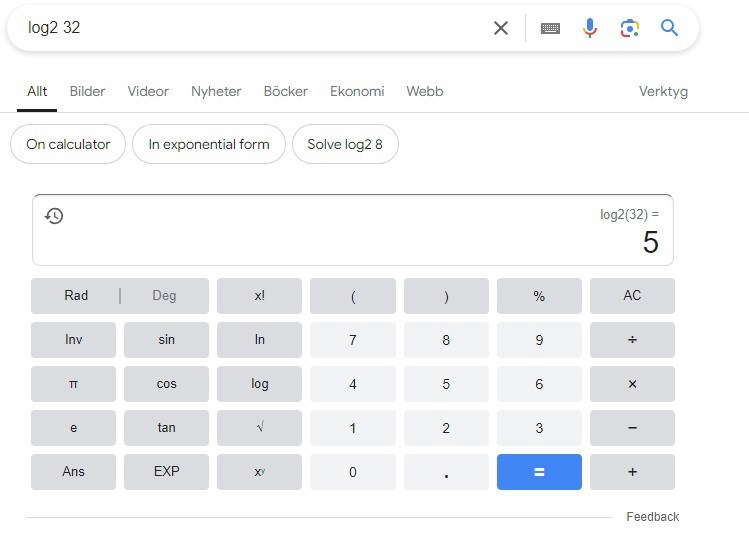 Jag löste den genom att bara multiplicera 2 tills jag kom till 32 (5 gånger). Men finns det någon annan uträkning till detta, jag tänker kanske en ekvation eller så och hur gör man i så fall?