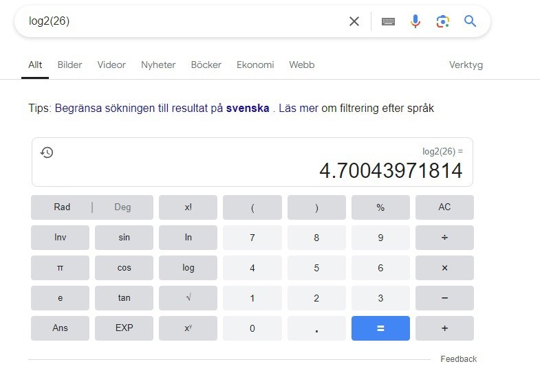 Ex. Vad ska jag upphöja talet 2 med för att få 26?