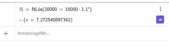 10 000 med 1.1 tills jag kom så nära 20 000 som möjligt, det blev 8 gånger, allts å8 år. Men jag fick lite under 20 000 så det är ungefär 8 år. Men hur kan man räkna ut detta mer "matematiskt" om man säger så. Finns det något effektivare sätt att räkna på?