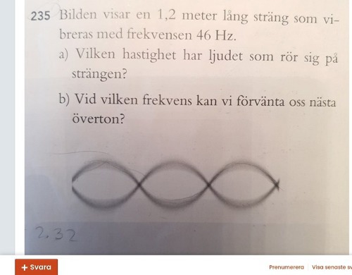 De anger att frekvensen är 46 Hz, vilket väl är för andra övertonens frekvens? Men sedan ska vi räkna ut för en våglängd (0,8) (och alltså inte 1,2 som täcker 1,5 våglängd pga det är andra övertonen) och denna ska multipliceras med andra övertonens frekvens, hur kommer det sig? Ska inte man räkna med grundtonens frekvens? eller iallafall för första tonens frekvens för att man räknar med en våglängd?