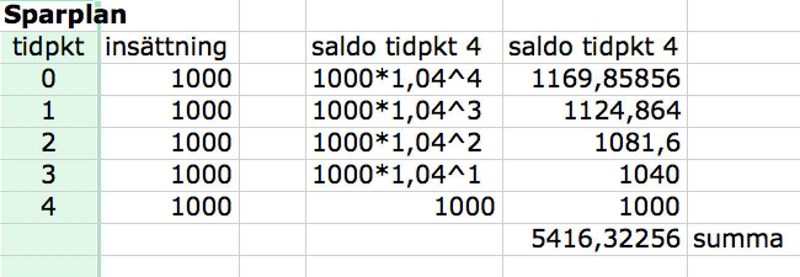 Precis som du, har jag tidpunkter i den första kolumnen. Det ger färre missförstånd än att använda år. Vid tidpunkt 0 gör vi den första insättningen, 1 000 kr, och fortsätter med det en gång om året, vid tidpunkterna 1 – 4.