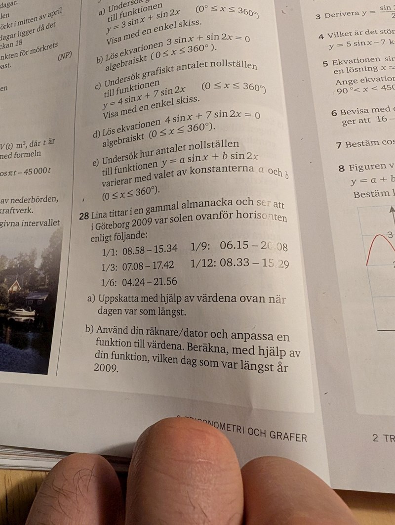 På fråga 28 b där ska man anpassa en funktion till värdena i en tabell där och ta reda på vilken dag som är längst..