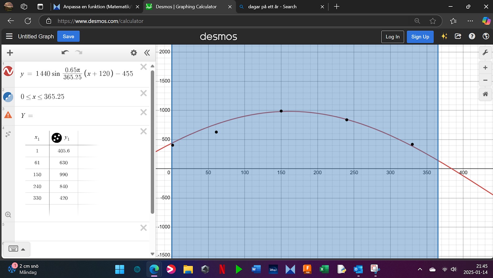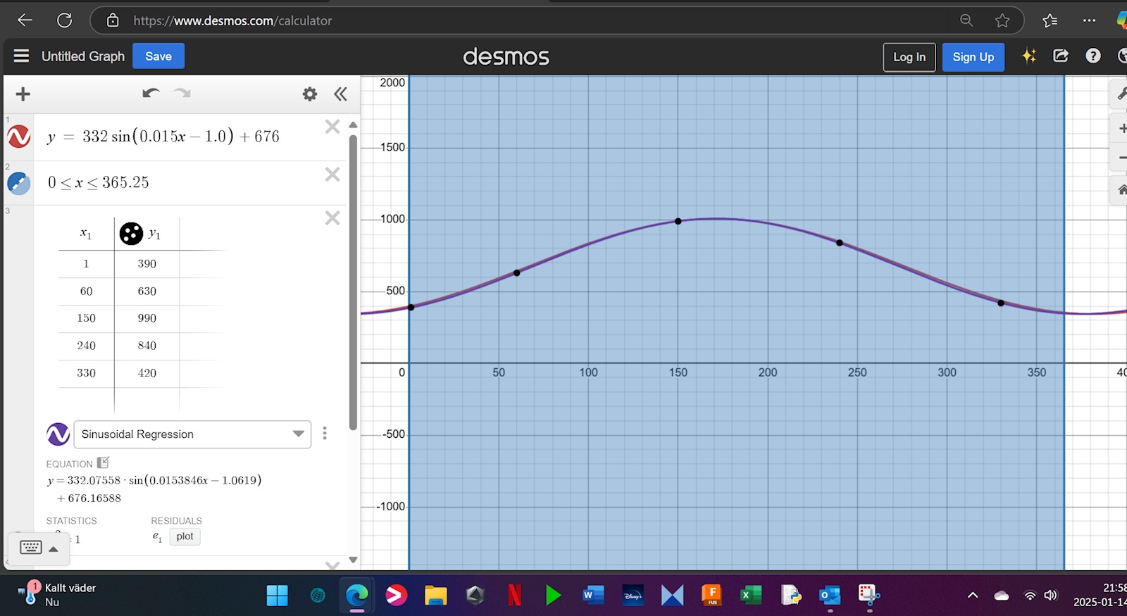 I uttrycket för sinus lär det finnas ett 2pi, ett x minus någonting konstant och det lär divideras med 365,25.