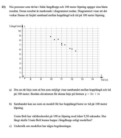 Jag har prov nästa vecka och denna är en bra repetions uppgift men förstår den inte helt. Uppgiften ser ut så här och det jag antar är att jag ska använda mig av en anpassad linje alltså genom regression men punkterna har massa decimaler om jag ska skriva av alla. vet inte riktigt hur jag ska börja och vad de egentligen vill ha. vilken metod osv.