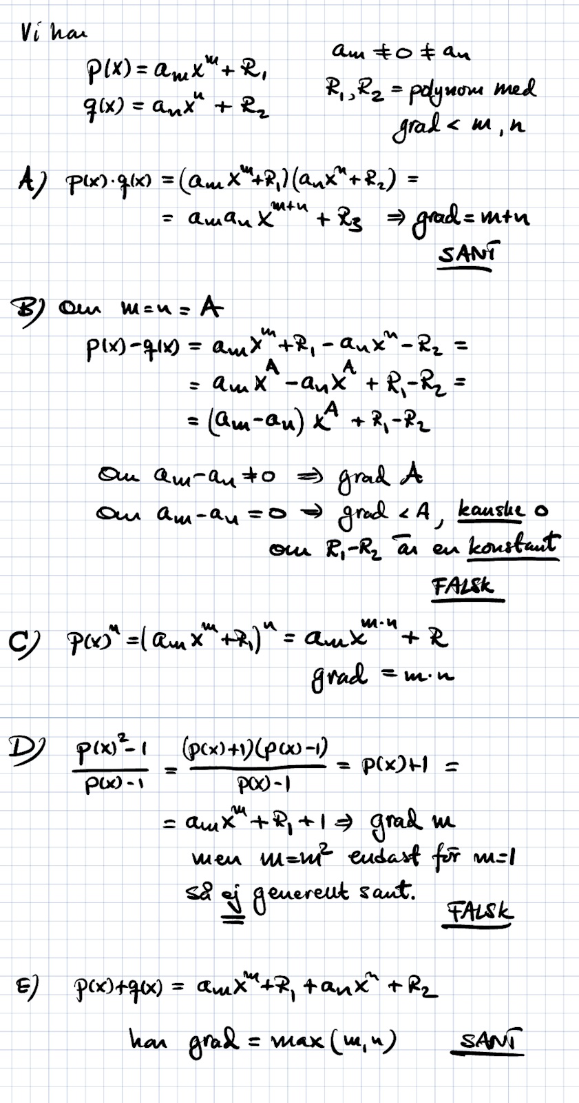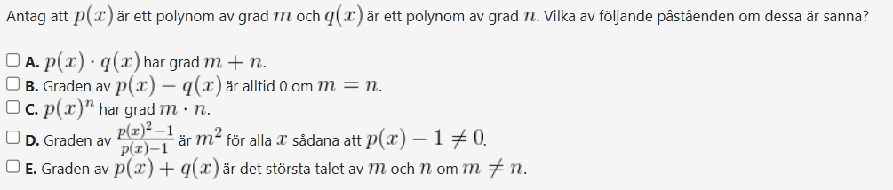 Låt p(x) = amxm + … + a0 och q(x) = bnxn + … + b0 där am och bn är skilda från noll. Testa utsagorna A, C och E.