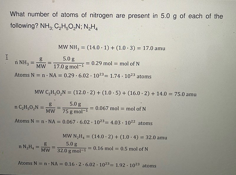 Det jag inte förstår med denna uppgiften är hur man kan få fram svaret angående antal atomer i enbart N genom att använda hela molekylens siffror och inte bara tex molecular weight av nitrogen i uträkningarna.