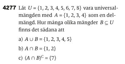 Jorgen skrev:Vet inte om jag kanske tolkar frågan fel, men i a) tycker jag att B mycket väl skulle kunna vara antingen {5}, {1,5},{2,5},{3,5},{4,5} eller någon annan större mängd med kombinationer av elementen {1,2,3,4,5}. Då vi inte vet hur B ser ut, hur kan vi då beräkna antalet delmängder för B i U?