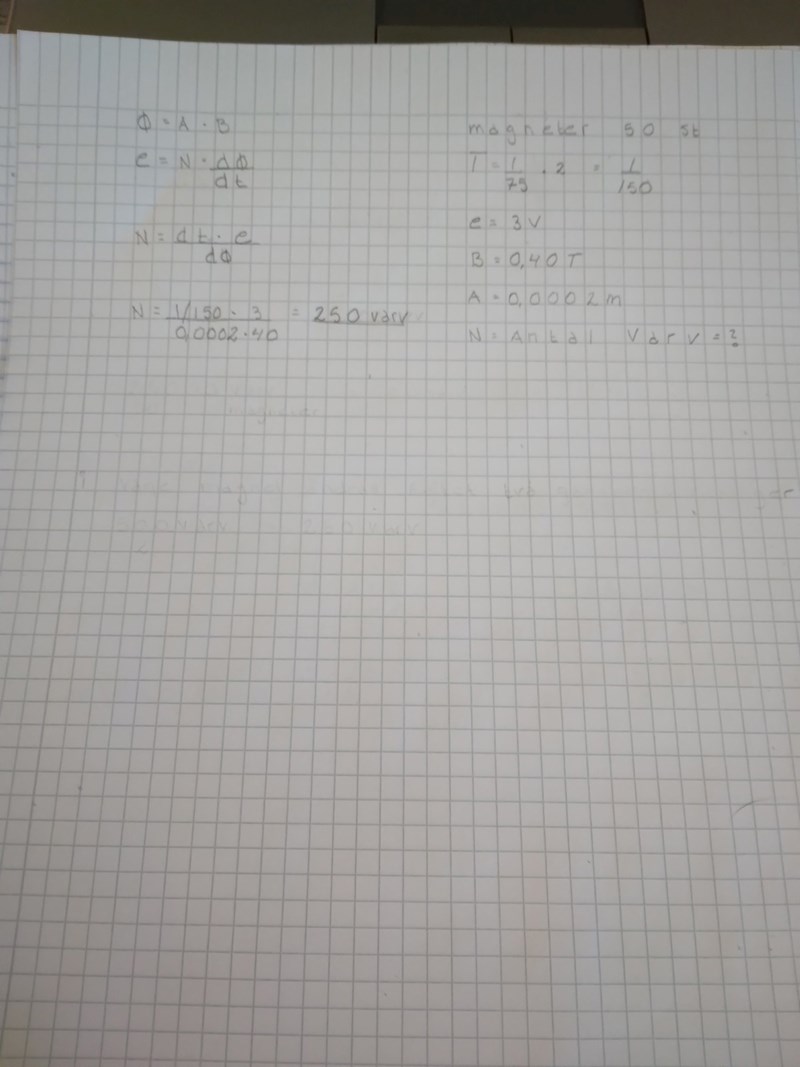 ε=NdΦdt\varepsilon = N \dfrac{{\rm d}\Phi}{{\rm d}t} där NN är det sökte antalet lindningar.