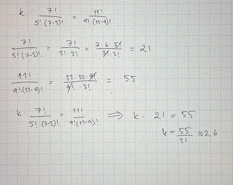 Glömde skriva att k*C(7, 5) = P(11, 9) är samma sak som den första raden i min beräkning.