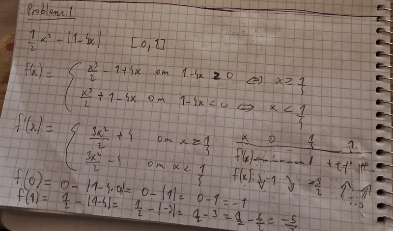 Så du menar att vi ska stoppa in 0 och 1 i derivatan eller vad ska man göra? Jag har gjort teckentabell och hittade att x=1/4 är en lokal min. Sen påstår sidan att jag har felaktiga största o minsta värde..