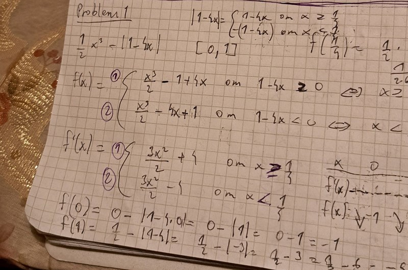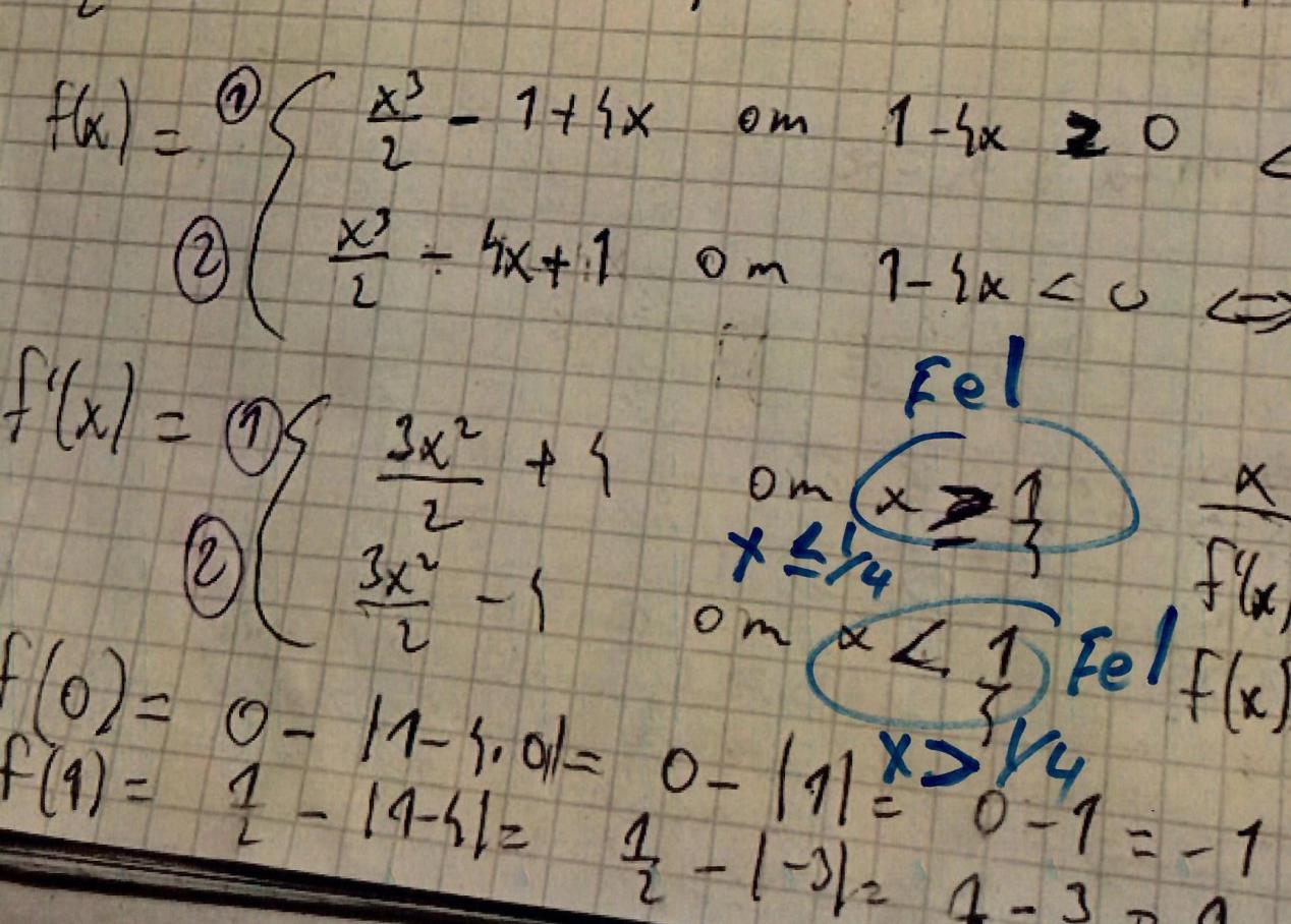 Ture skrev:Jag tror du har förväxlat dina två derivator, den första raden är väl om x är mindre än 1/4?
