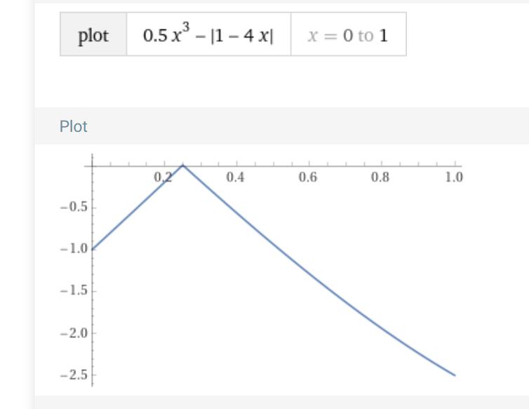 Eftersom funktionen är kontinuerlig i hela intervallet (även om den inte är deriverbar överallt) och det finns funktionsvärden som är större än definitionsgränsernas funktionsvärden så finns det ett lokalt max.