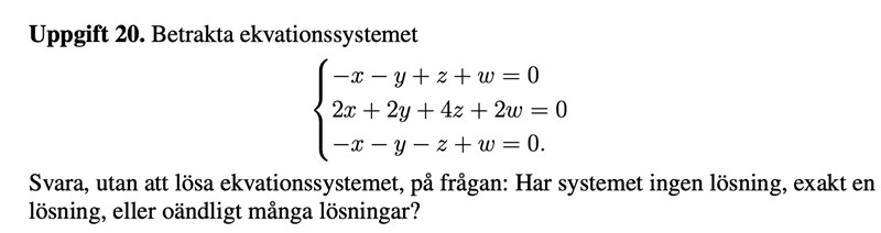 Man kan skriva uppgiften ovan som: Ax = b, där A är en 3 × 4-matris (alltså m × n där m < n). Vi vet även att b = nollvektorn. Därav måste uppgiften ovan ha oändligt många lösningar (enligt förklaring ovan)