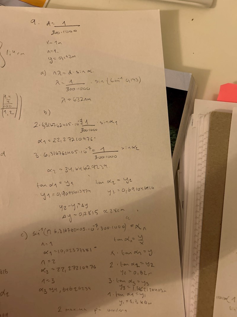 jag tänker på så vid 3 maxima så blir y 1.38meter från central maximi och det får väl inte vara mer än 1m eller har jag tänkt fel?