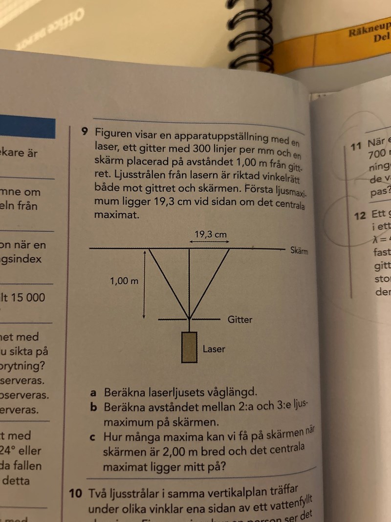 I fråga C här nere så frågar antalet maxima som får plats på skärmen, enligt dom så blir det tre på vardera sida men mina beräkningar säger att den tredje hamnar utanför, har jag gjort fel eller är det så att jag misstolkar frågan?